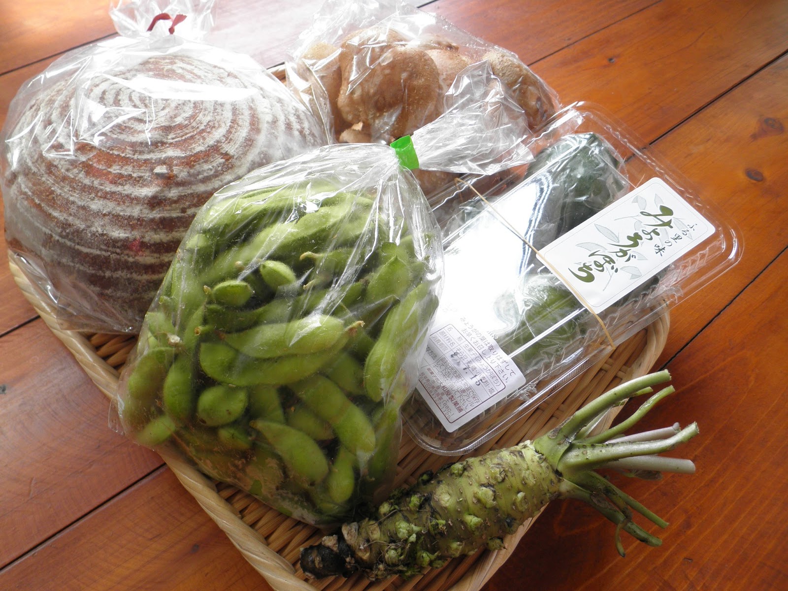 先日、岐阜に引っ越した生徒さんから、嬉しい贈り物を頂きました。左奥から、手作りの天然酵母パン、原木しいたけ、みょうがぼち(和菓子)、生わさび、枝豆。